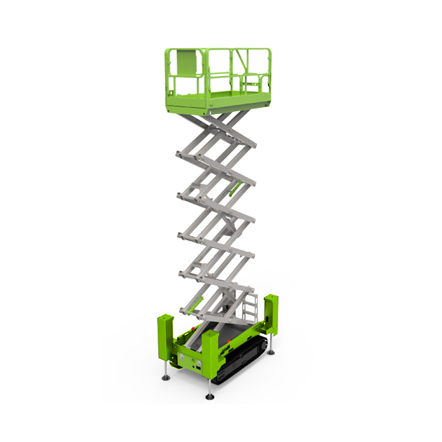 The 8m crawler scissor lift with self-leveling is based on the crawler chassis and scissor lift structure, with automatic leveling hydraulic legs added, which can automatically adjust the platform level on uneven ground, further improving safety and application range.